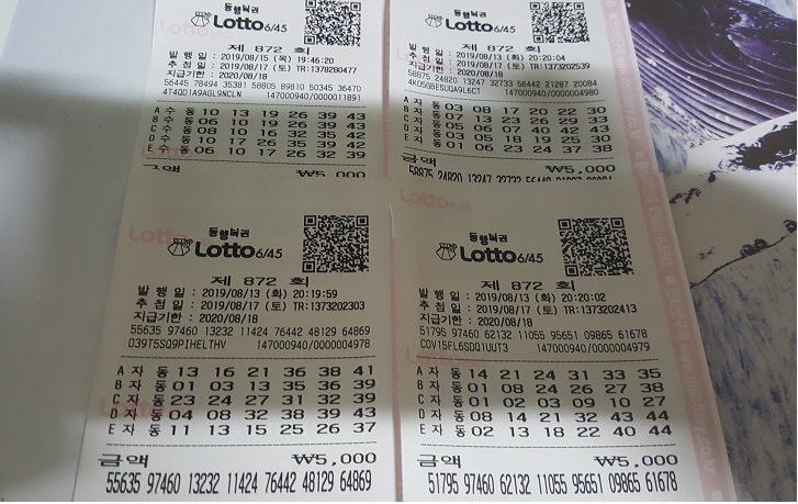 출현 번호 조합으로 5조합을, 나머진 자동 구매를 하였습니다.