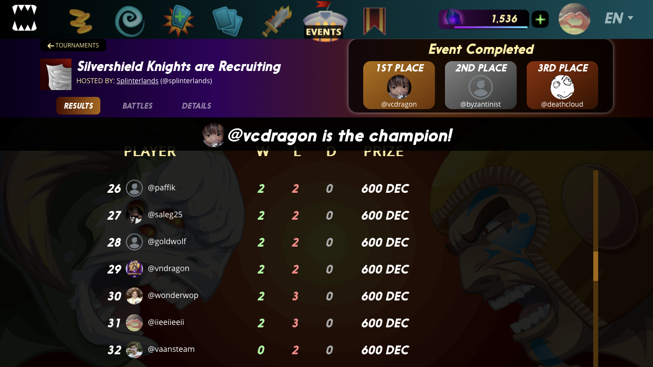[스몬]어제의 일퀘와 토너먼트 입상iieeiieeii (62)in #sct • 7 years ago 적당한 시간이 걸려서 일퀘를 끝냈네요 다만 보상이..... 엇그제 레전드가 나왔으니 기대는 안했지만 ㅎㅎㅎ 오랜만에 토너먼트에 입상 했습니다 토너먼트에서 32등을 목표로 항상 도전하고 있죠 다행히 31등으로 안착 ㅎㅎㅎ #sct-kr #sct-freeboard #palnet #zzan #iv #spt #steemace #jjm