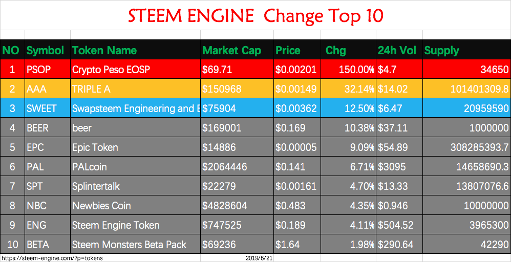 9 ENG Steem Engine Token $747525 $0.189 4.11% $504.52 3,965,300.00