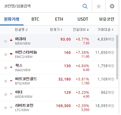 업비트 기준 오늘의 알트 상승 코인들