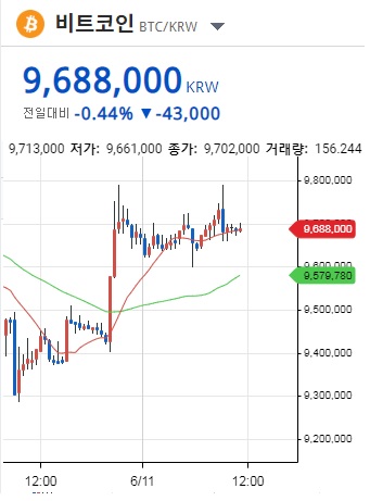 아직 갱신은 안되었는데 현재 업비트 가격 보니깐 9,689,000 대네요. 오늘 가격대가 갱신이 안되었군요.