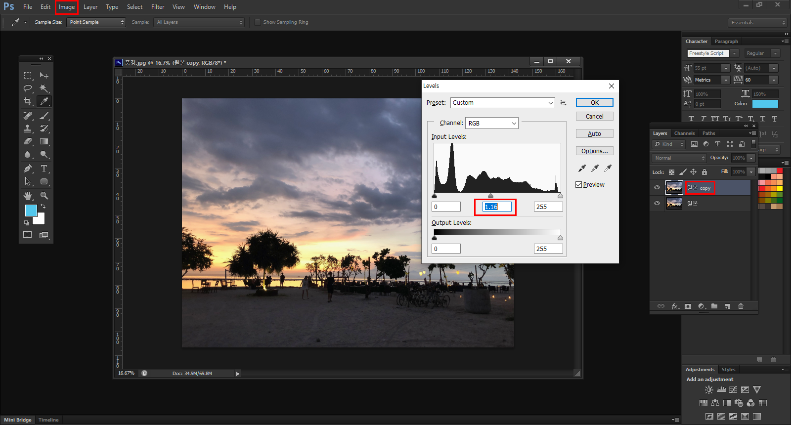 이미지의 밝기를 직접 편집할 것이기 때문에 Image-Adjustments-Levels을 클릭합니다.