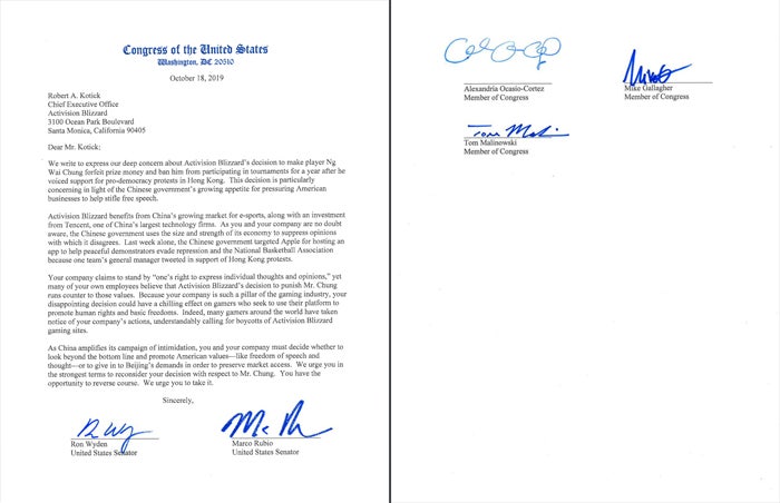 미국 의원들이 블리자드에 보낸 서한에는 블리자드가 중국 기업 투자를 받고 있지만, 여전히 미국 기업이란 점을 강조하면서 "(블리자드가) 개인의 생각과 의견을 표현할 권리를 옹호한다고 하지만 정작 반대의 행보를 보이고 있다"면서 "중국 시장에 굴복할 것인지 표현의 자유와 같은 미국적 가치를 지킬 것인지 선택해야 한다"라고 지적했다.