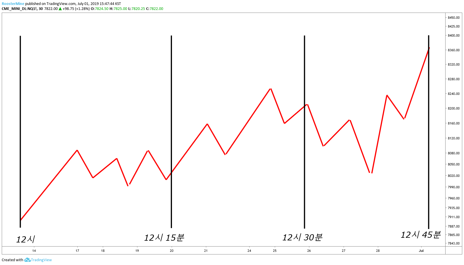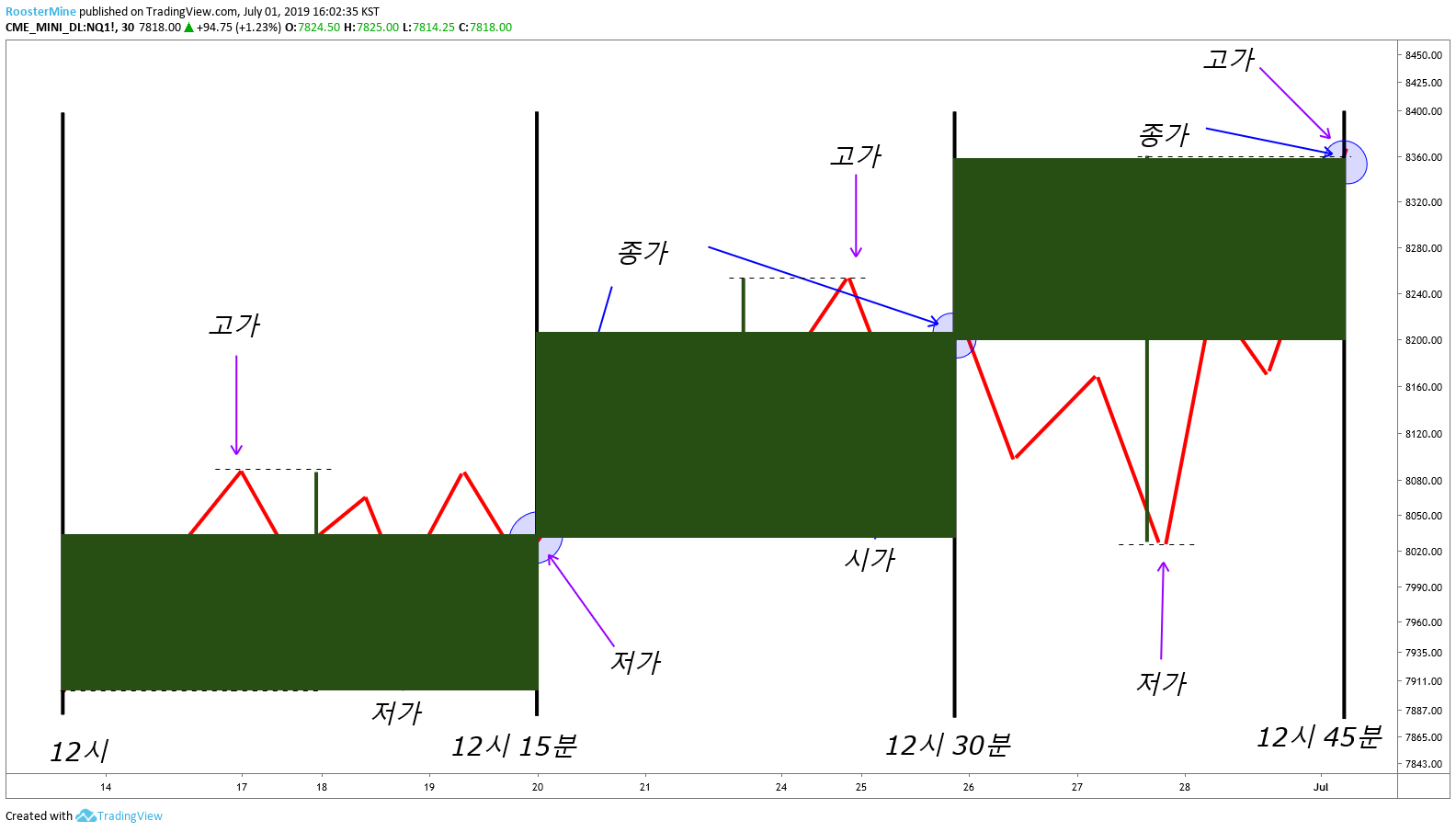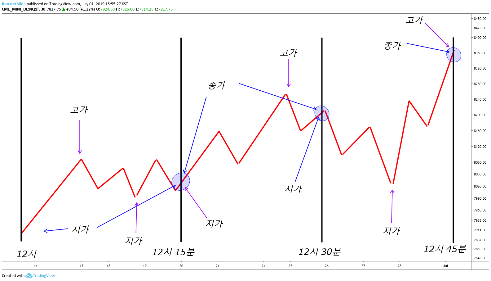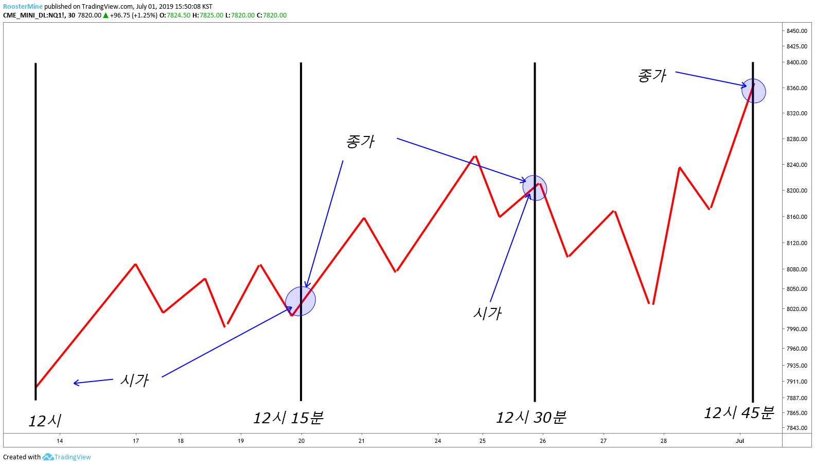 시가는 그 구간을 처음 시작했을 때의 가격을 뜻합니다. 위 예시에서는 12시, 12시 15분, 12시 30분 가격이 시가에 해당하게 되죠.