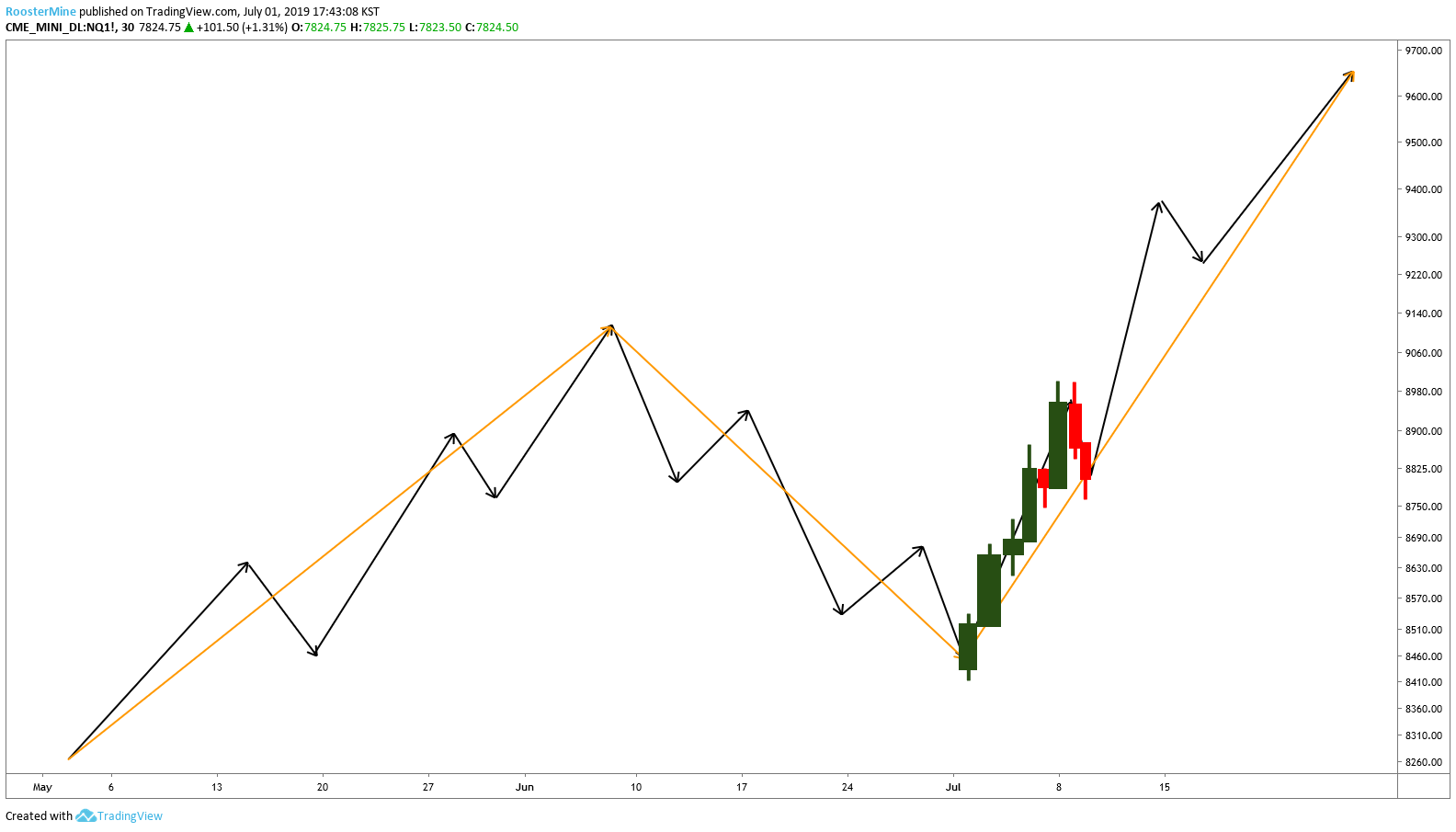 이런식으로 말이죠. 그래서 보통 추세를 볼 때 큰 추세/작은 추세를 파동으로 보고, 나머지 진입을 위한 디테일한 부분들을 캔들로 보라고 하는 것 입니다!