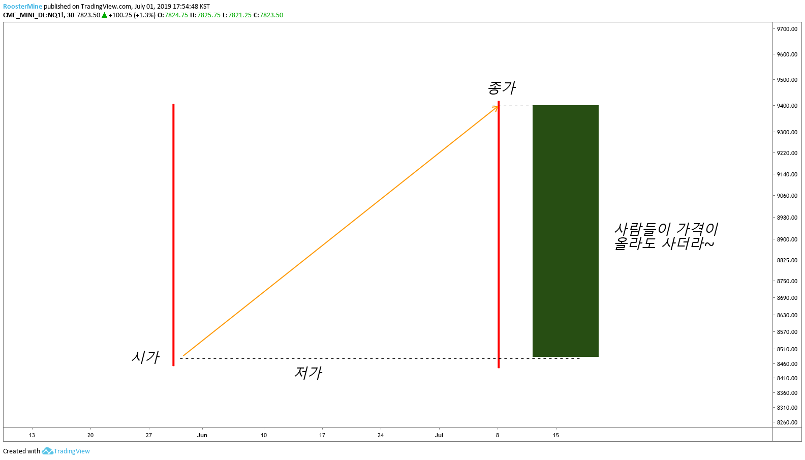 또한 가격이 상승하여 비싸졌음에도 불구하고, 사람들이 사고 있다는 점을 표시해줍니다.