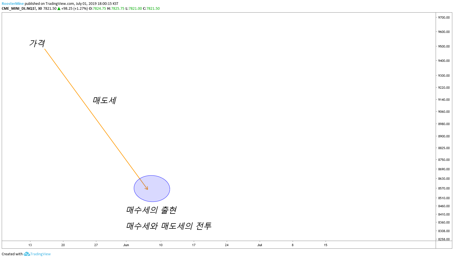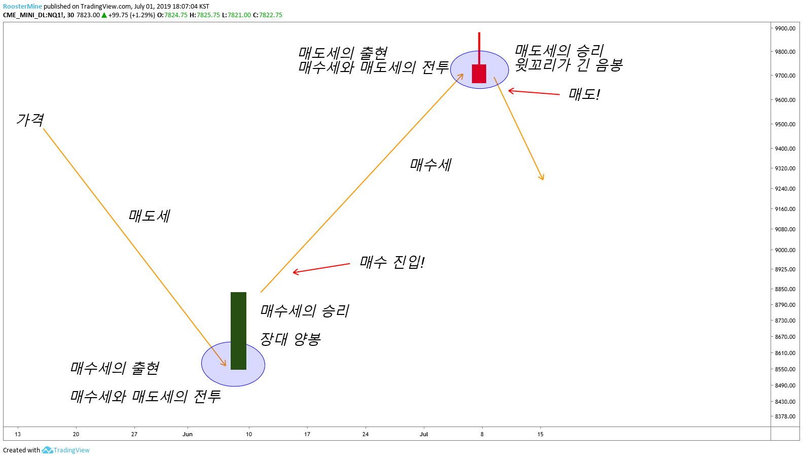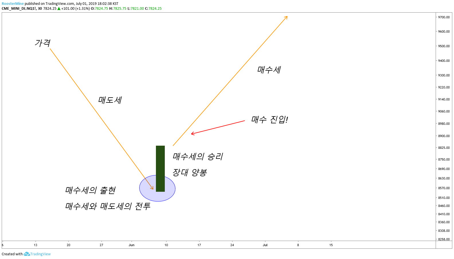좀 더 단순화를 시키면, 가격이 하락하고 있을때 어느순간 매수세의 출현으로 매수자와 매도자가 싸우게 됩니다. 그리고 당연하게도 시간이 흐름에 따라 승자가 나오게 됩니다. 캔들이 그 것을 보여주는 것 입니다. "승자". 결과가 나오고 나서 승자를 보여주는 것이지, 현재 저 가격에 머무를때 승자를 예측할 수 있는자는 없습니다.