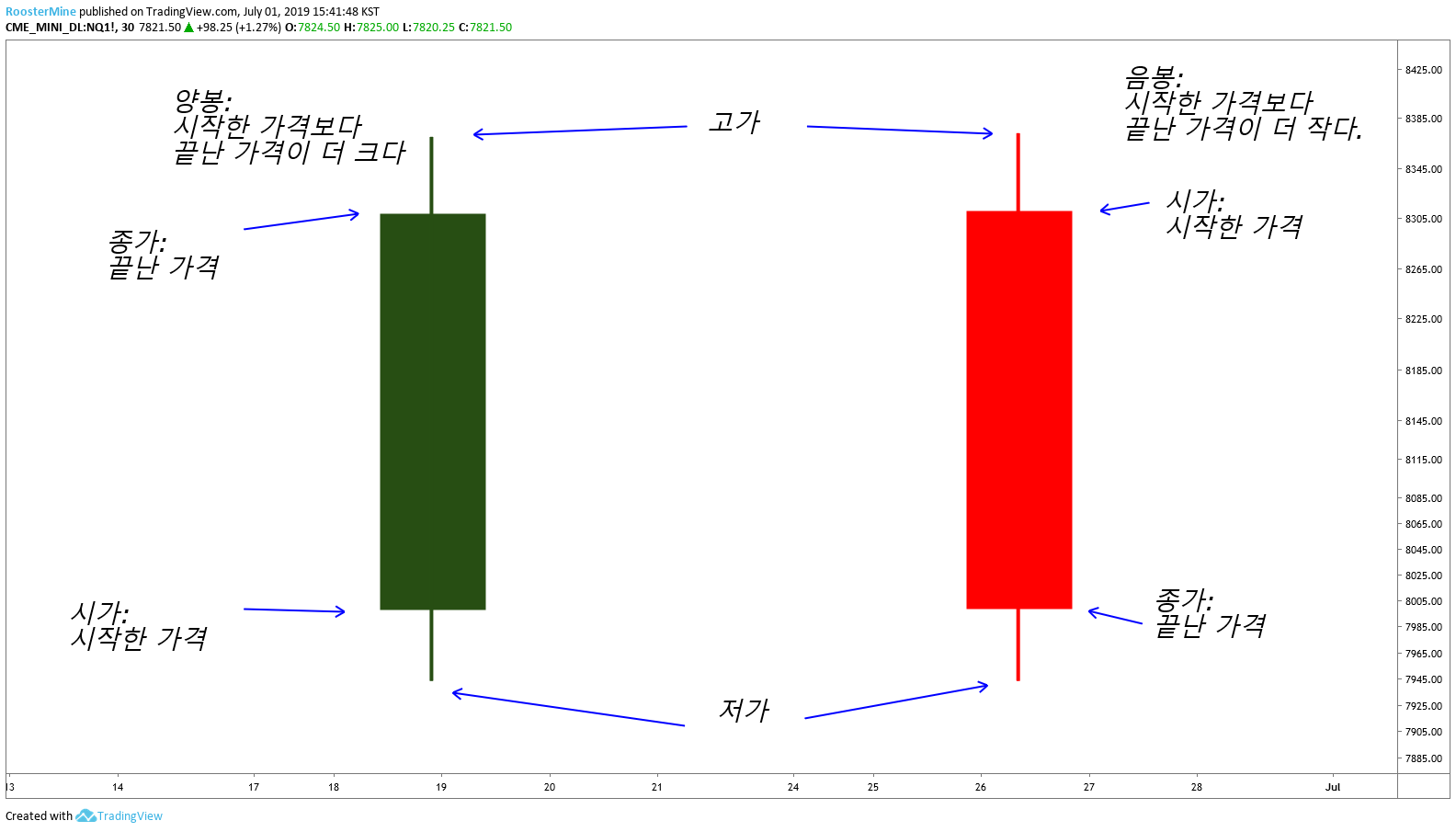 위 가격을 예시로 시가/저가/종가/고가를 표현해보겠습니다.