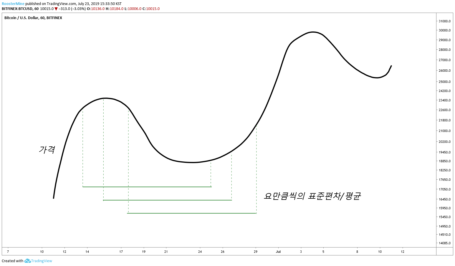 다들 한 번씩 들은 이런 종 모양을 보셨을 겁니다! 값들이 어떻게 분포해 있나 를 봤을때 평균을 기준으로 표준편차 (시그마) 안에 대충 70% 의 값들은 정도는 들어간다 라는 뜻 입니다. 물론 가격 데이터가 엄밀하게 정규 분포를 따르진 않겠지만, 극점을 찾는데에는 어느정도 도움이 될 거라고 믿기에 실험적으로 접근해보겠습니다!