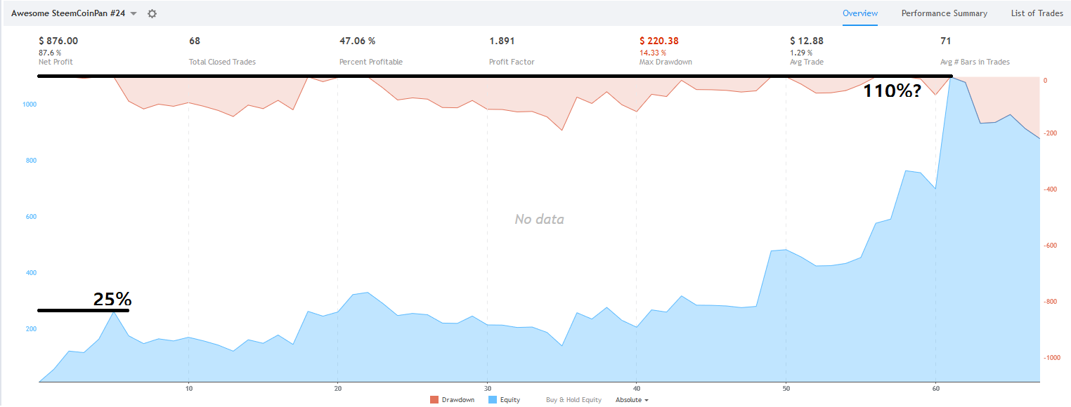 그리고 현재 수익률이 아닌 최고 수익률은 100% 가 넘은 전략이며, 시작 후 보이는 작은 피크도 20% 정도 되는 수익률을 보이고 있습니다.