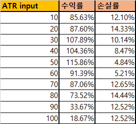 가장 먼저 ATRinput 값을 조절해 보겠습니다. 현재 ATR 의 기준으로 모든 값들이 변화하고, 진입 또한 ATR 의 기준으로 만들어 지기에 수익률에 가장 큰 영향을 미칠 거라고 생각하기 때문이죠.