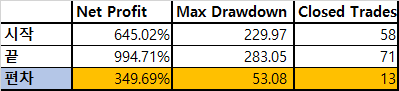 수익률이 1.5배 가량 증가 했으며, 손실률은 20% 정도 증가! 이런 불균형 아주 좋습니다. 진입 횟수도 증가하여 약간의 신뢰도를 높여주었습니다!