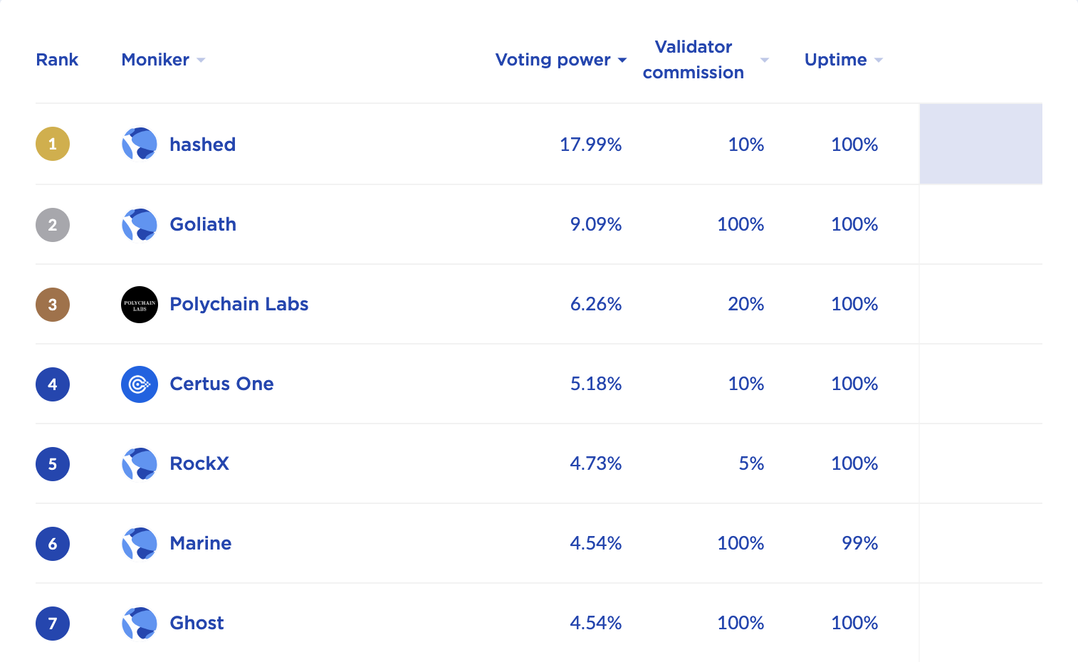 현재 Staking 가능한 Validator 리스트는 63개 가량 됩니다. 원하는 Validator를 선택 후 Staking 설정을 하시면 되겠습니다.
