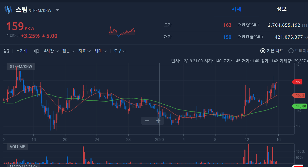 스팀은 이제 160원대로 올라서는 중이고, 이번 랠리때 200~300원대는 가주면 좋겠네요. 차트는 별 의미가 없겠지만 4시간봉은 괜찮아 보이네요.