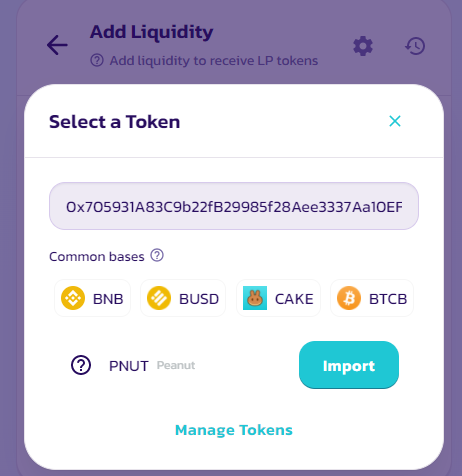 토큰이 검색됩니다. Import 시켜주고, BNB랑 원하는 수량 넣어주면 됩니다.