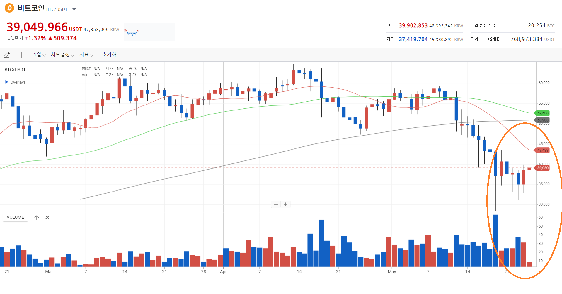 오늘 비트코인 일봉에서 타원 안의 최근 비트코인 가격이 회복된 구간을 보면 어제부터 10%이상 상당히 많이 올랐는데 거래량이 받쳐주지 않고 있네요.