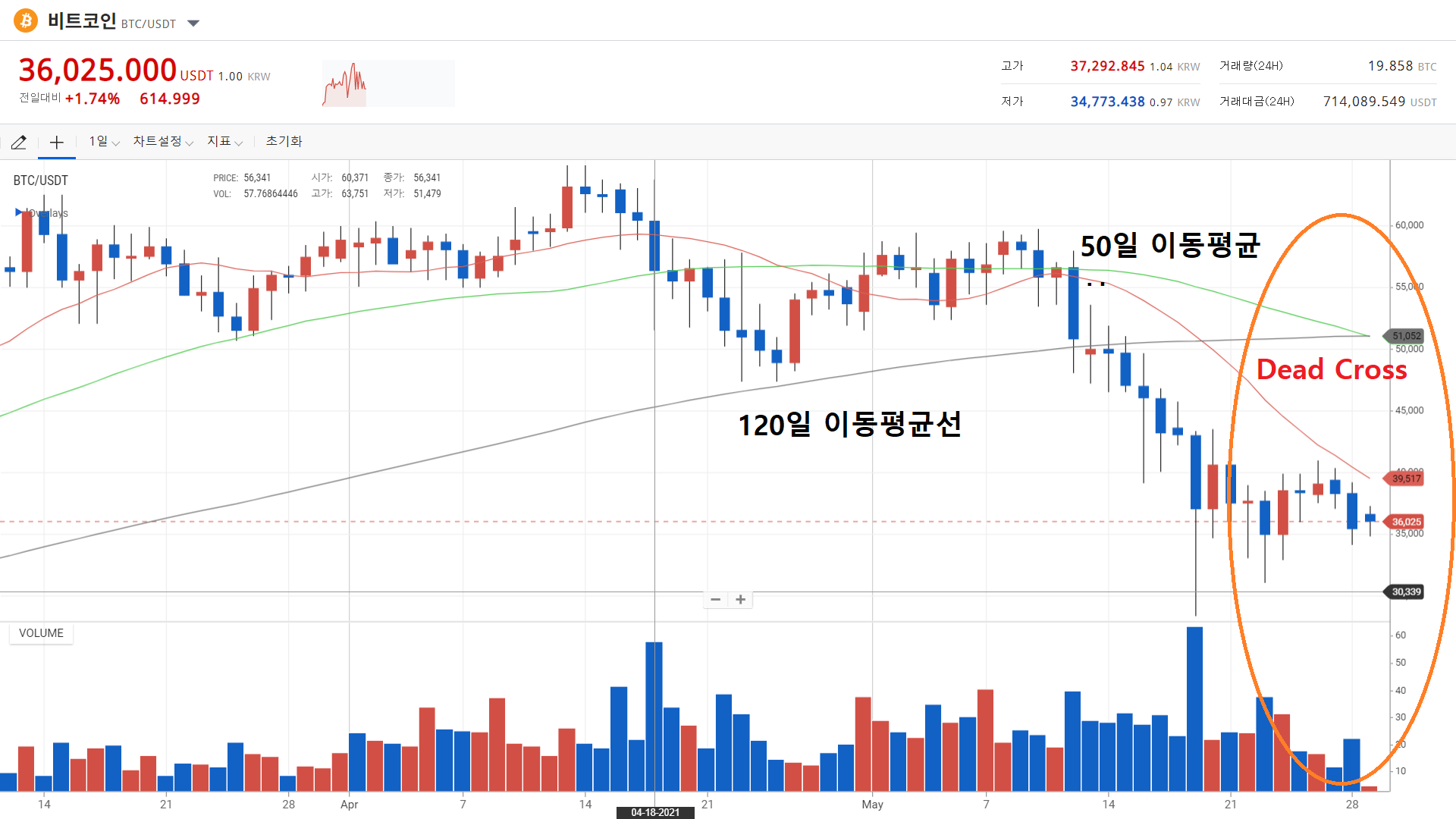 오늘 5월 29일 비트코인이 재반등하지 못하고 횡보하며 3500만원 선 박스권에 있더니 드디어 50일 이동평균선과 120선에 데드크로스가 발생했습니다.