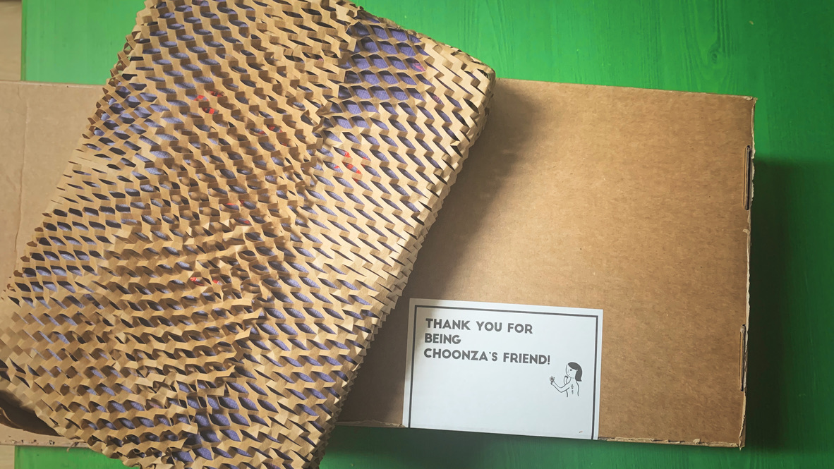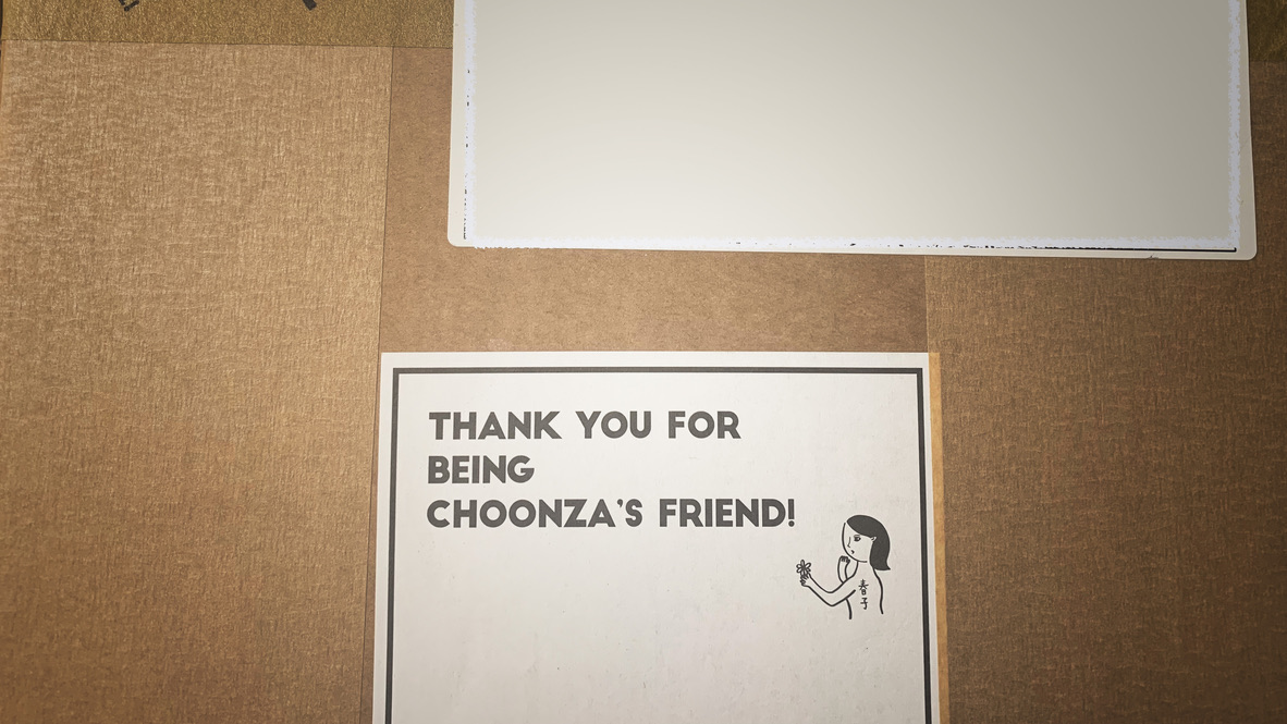 친환경 소재로 박스 테이핑을 하셨는지, 박스와 박스를 고정시킨 테이프의 색감에서 일단 훅 갑니다. 이런 고급짐이. 이런 디테일이 합니다. 게다가 춘자가 고맙다고 인사까지 하네요. 제가 친구 맞는 걸까요?! friend가 어색하긴 하지만..... 그래도 느낌 좋은 스티커가 택배 송장 아래 붙여져있습니다. 택배 아저씩도 춘자가 만든 책 사서 볼 듯해요. 지나가는 사람도 춘가 궁금할 듯하구요.
