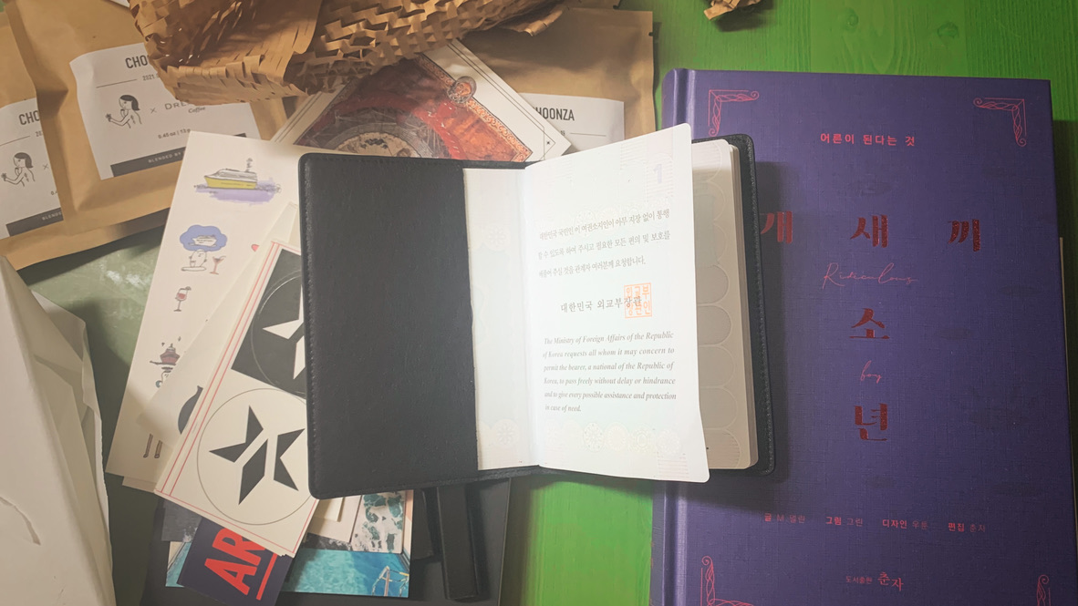 그리고 금장 로고 박힌 여권지갑, 엄청 있어 보입니다. 저 금장은 어떤 의미일까요? 궁금해 하여라 하는 사인을 제게 줍니다. 코로나 백신 맞고 뿅하고 날아다니려고 여권 벌써 챙겨넣었습니다.