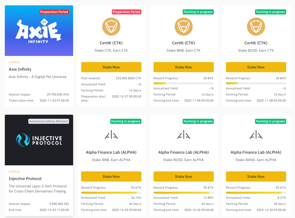 바이낸스 런치패드의 주기가 확실히 빨라진 모습입니다. 바이낸스에서 알파 파이낸스와 인젝티브 프로토콜에 이어 17번째 바이낸스 런치패드 프로젝트로 Axie Infinity를 발표하였습니다. 이번 런치패드의 티켓 클레임을 위한 BNB스냅샷은 내일(10월 27일) 오전 9시부터 11월 3일까지 진행될 예정입니다.