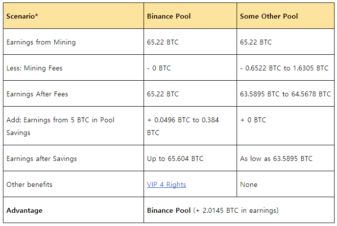 예를 들어, 한 채굴자가 100 PH/S를 바이낸스 풀에 연결했을 때와 다른 마이닝 풀에 연결했을 때, 위의 표와 같이 평균적으로 65.22 BTC의 수익을 얻을 수 있습니다. 만약 여기서 채굴자가 5 BTC를 풀 세이빙즈에 넣는다고 가정해보겠습니다.