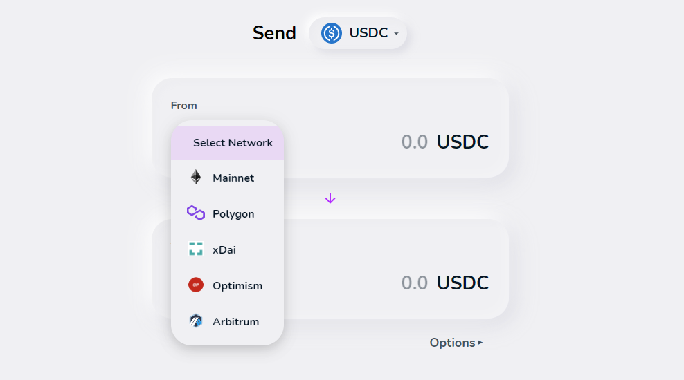 이더리움 메인넷, 폴리곤, xDai와 아비트럼 및 옵티미즘까지 지원하는 홉입니다. 전송을 지원하는 자산 종류는 MATIC, USDC, USDT이며 실제로 이용해본 결과 레이어2 체인(아비트럼 및 옵티미즘)으로의 이동에는 제법 시간이 걸리는 편입니다.