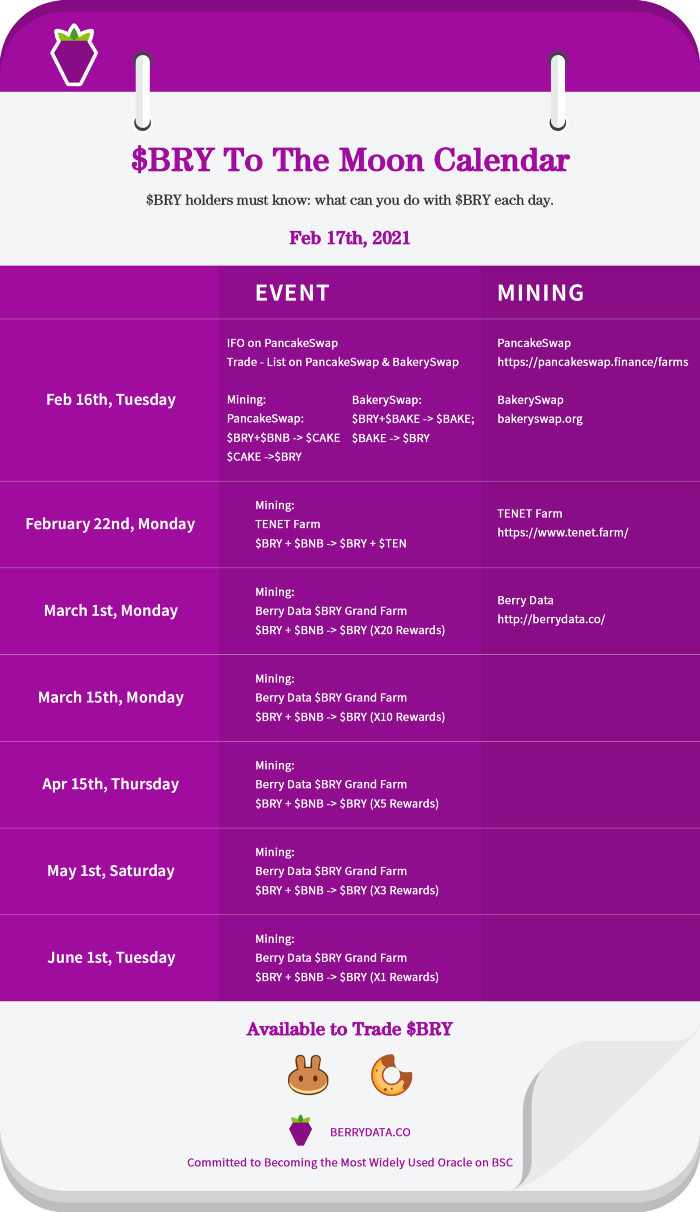 3월 1일부터 2주 동안은 BRY/BNB 풀의 20배속 파밍이 시작되며 배속은 지속적으로 감소하지만 BRY홀더들이 더 많은 BRY를 마이닝할 수 있는 이벤트가 6월까지 이어질 예정입니다. 정말 많이 올랐음에도 불구하고 아직은 BRY의 수량을 적극적으로 늘려야 할 때가 아닌가 싶습니다.