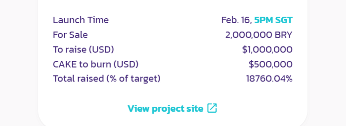 1 BRY당 0.5달러의 가격으로 시작된 IFO는 187.6:1의 경쟁률을 기록하면서 팬케이크스왑의 인기와 CAKE-BNB 홀더들의 위력을 보여줬고, IFO 직후 BRY토큰은 판매가격의 약 17배 정도인 16.5달러에 도달하였습니다.