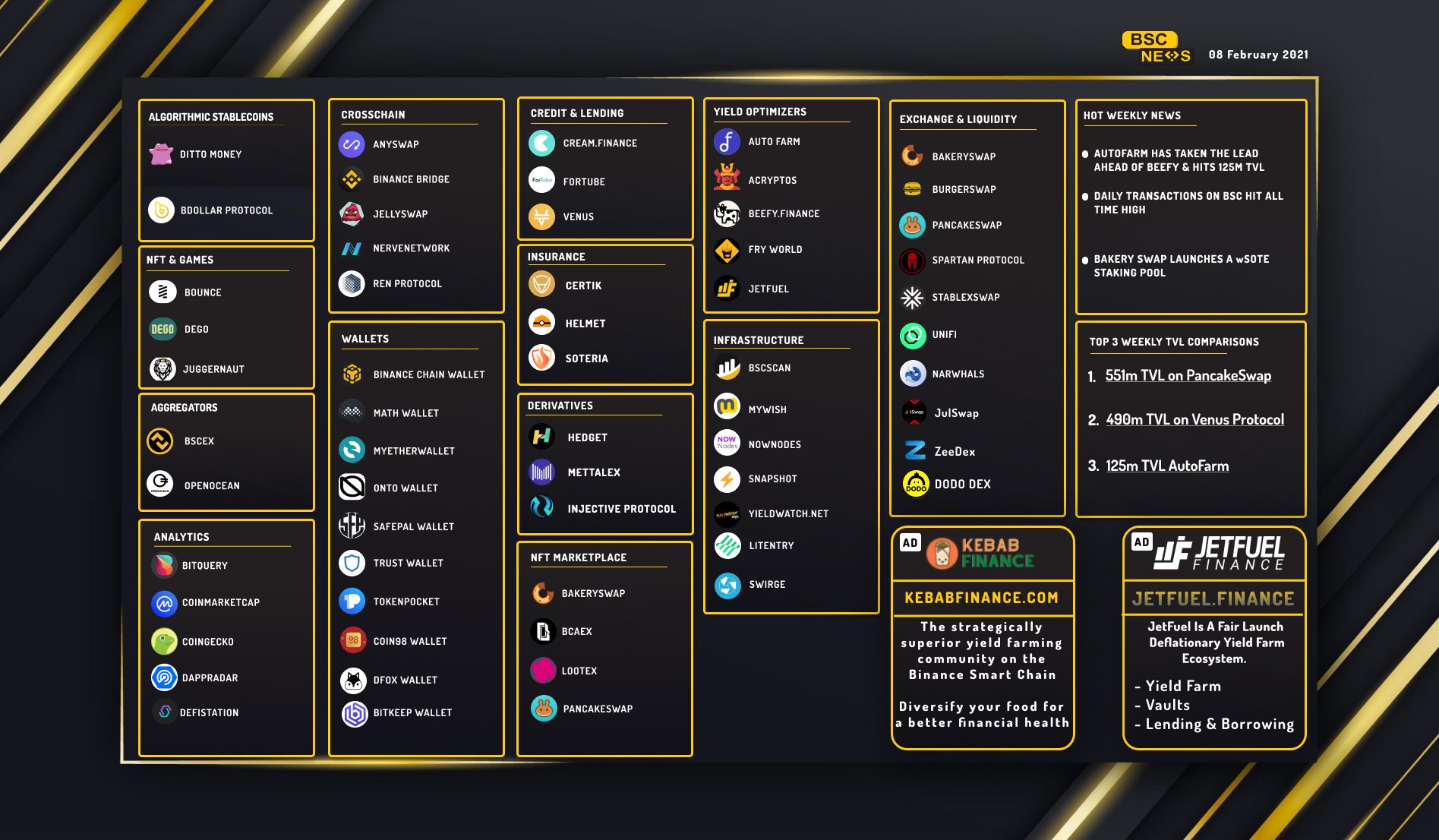 2021년에 가장 주목해야 하는 체인은 단연 바이낸스 스마트 체인(BSC)이라고 할 수 있으며, (트레이딩에 엄청난 소질이 있는 것은 아니라는 가정 하에) 수익률의 편차는 바이낸스 스마트 체인을 이용할 줄 아는가 모르는가에서 갈릴 것으로 예상됩니다. BSC에 관심을 가지고 입문을 하실 분들을 위해 TVL이나 APY, 편의성 측면에서 어느 정도 성숙이 되었고 나름 안정화된 상태에 있는 프로젝트들을 간단하게 요약하여 소개드립니다.