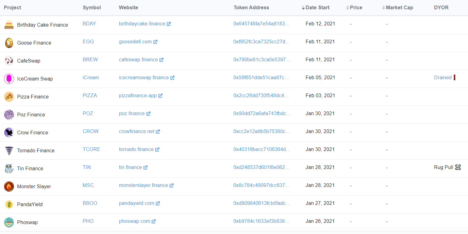 - BSC스캔에서 제공하는 일드파밍 프로젝트들의 정보를 확인할 수 있습니다. Token Address나 시작일자 등을 확인하실 수 있으나, 여기서 제공되는 정보가 안전하다는 것을 보장하지는 않으니 항상 주의하셔야 합니다