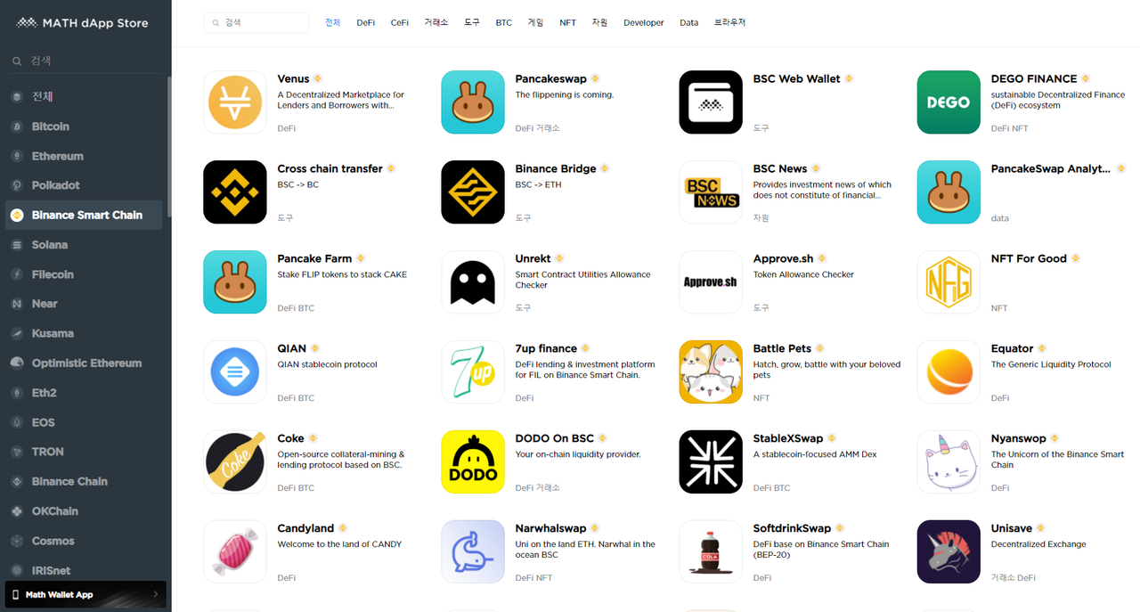 - 매쓰월렛팀에서 만든 디앱스토어 포탈입니다. 바이내스 스마트체인 뿐만 아니라 여러 체인들의 디앱 정보가 잘 요약되어 있습니다