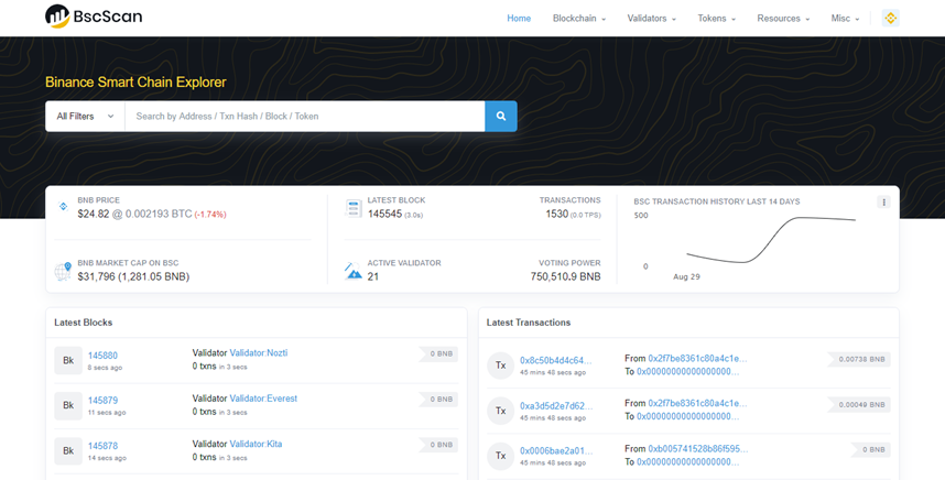 - 이더리움에 이더스캔이 있다면, 바이낸스 스마트체인에는 BSC스캔이 대표 블록익스플로러입니다. (실제로 BSC스캔은 이더스캔 팀에서 만들었습니다)