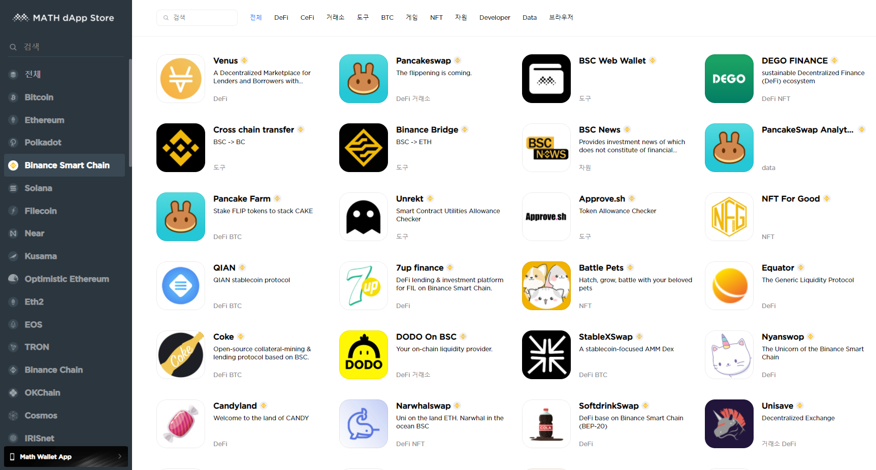 매쓰 디앱 스토어는 다양한 퍼블릭 블록체인들의 올인원 멀티 월렛 서비스인 매쓰 월렛(Math Wallet)팀에서 제공하는 서비스로 바이낸스 스마트 체인(BSC) 뿐만 아니라 이더리움, 이오스, 폴카닷, 솔라나 등 정말 다양한 블록체인들의 디앱 정보를 모아놓은 곳입니다.