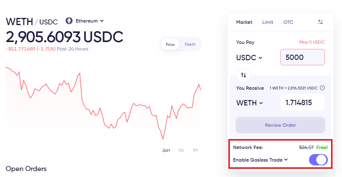 ④ 화면 하단에 보이는 Gasless Trading 옵션을 활성화합니다