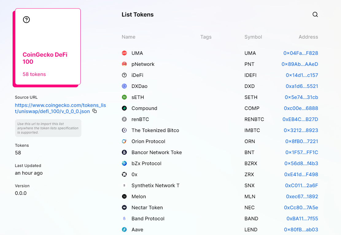 얼마 전에 런칭한 트론 버전의 유니스왑인 저스트스왑에서는 토큰 화이트리스트 제도를 운영 중에 있으나, 이 또한 특정 중앙화된 운영 주체가 관리를 한다는 측면에서 장기적인 지속가능성에 한계가 있습니다. 그래서 유니스왑에서는 다양한 프로젝트들의 리스트를 유지하고 관리하는 것으로 명성이 있는 다양한 커뮤니티에서 탈중앙화된 방식으로 토큰 리스트를 관리하는 Tokenlists의 운영을 시작하였습니다.
