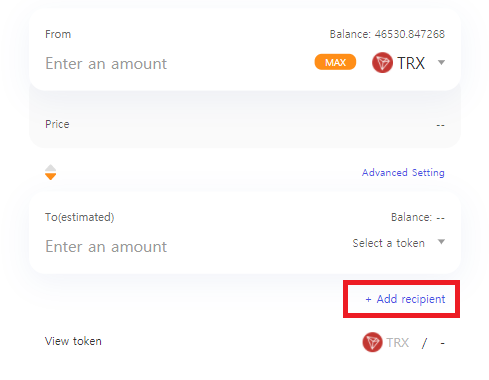 저스트스왑에서는 주계정에서 토큰을 스왑하여 곧바로 부계정으로 바꾼 토큰을 전송하는 것도 가능합니다. 예를 들어서 A라는 계정에 TRX이 있고, B라는 계정에 JST를 보내고자 하는 경우에는 위의 화면에서 [Add recipient]라는 버튼을 클릭해줍니다.