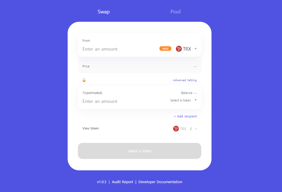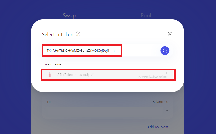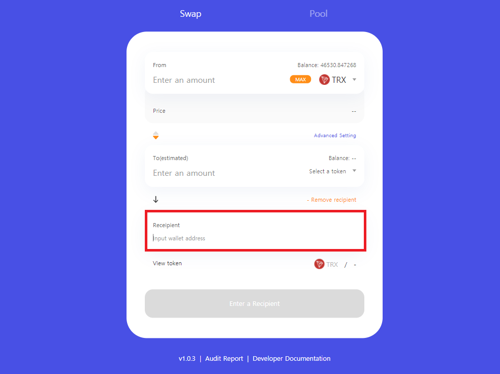 그러면 그 아래에 [Receipient]라는 메뉴가 생기며 [Input wallet address]라는 빈칸이 나타나는데, 해당 빈칸에 부계정(B계정) 주소를 넣고 스왑을 진행하시면 JST토큰과의 교환을 위한 TRX의 지불은 본계정(A계정)에서 하지만, JST토큰은 부계정(B계정)으로 들어가게 됩니다.