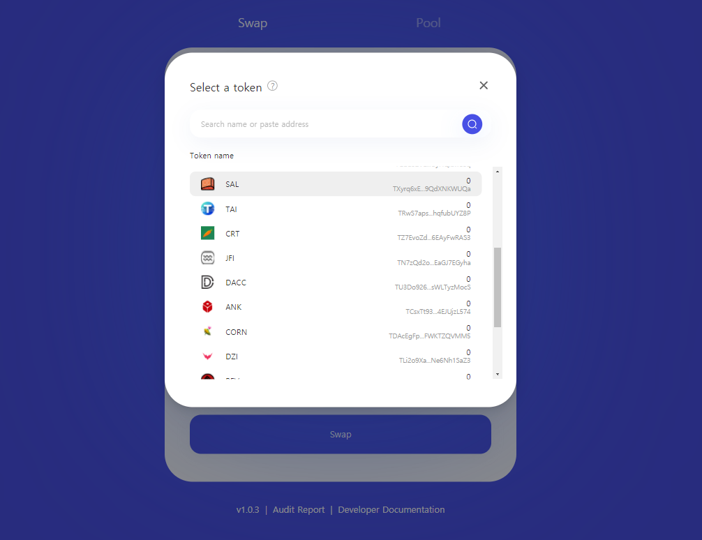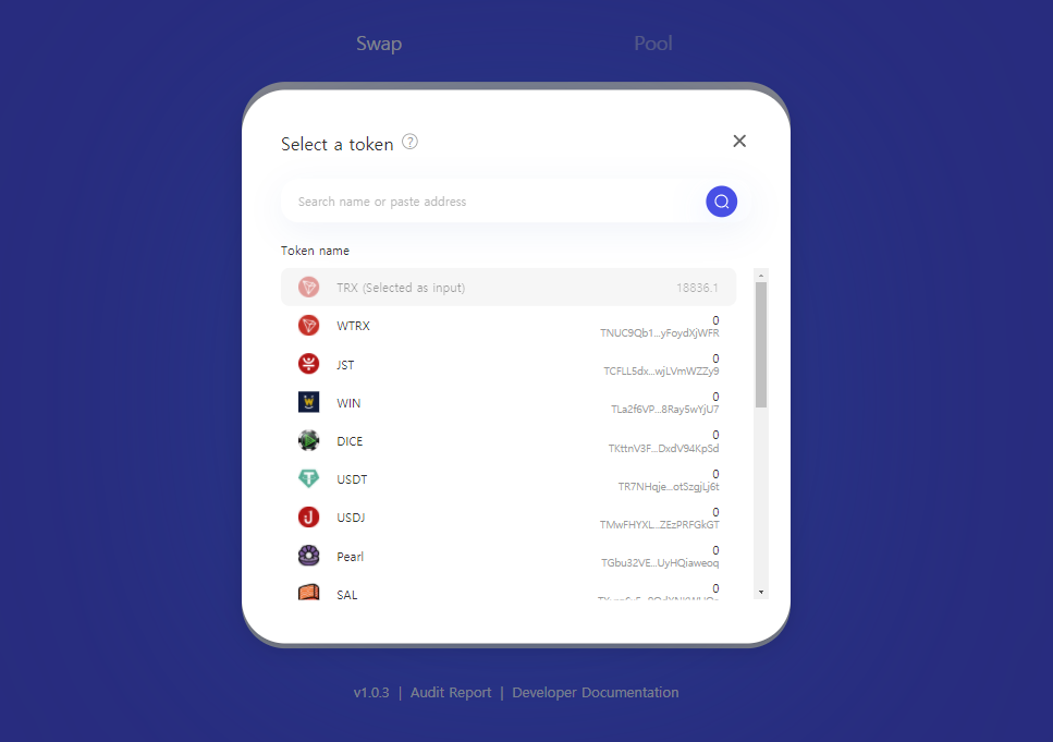 스왑 기능은 우리가 거래소의 BTC마켓에서 비트코인으로 다른 알트코인을 구매하는 것과 완전히 동일한 기능입니다. A라는 토큰을 시스템의 교환 비율에 맞춰 B라는 토큰으로 바꾸는 기능으로, 위와 같이 TRX, WTRX(Wrapped TRX), JST, WIN, DICE, USDT, USDJ, Pearl, SAL 등 트론(TRX)이나 트론 블록체인 기반의 다양한 TRC20 토큰들을 교환할 수 있습니다.