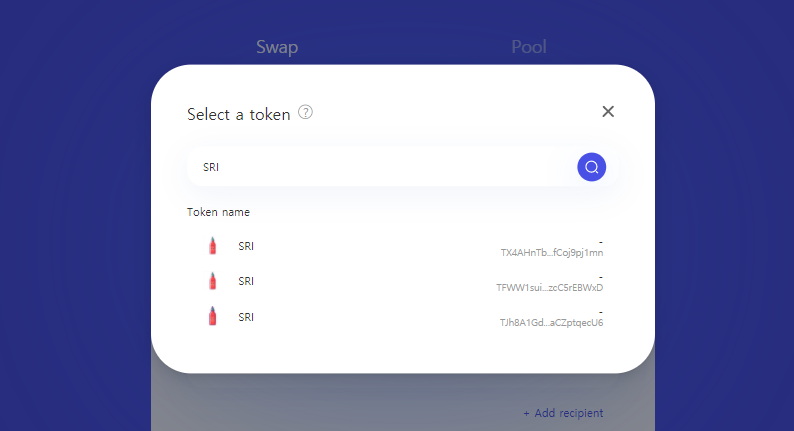 이제 문제는 저스트스왑에서 내가 거래하고자 하는 토큰이 리스트에서 보이지 않는 경우입니다. 이런 경우에 초보자들이 흔히 저지르는 실수가 토큰 심볼(티커)만 입력하는 것인데, 아래의 화면과 같이 심볼만 입력하는 경우에는 잘못된 스캠 토큰이 검색되어 이를 선택할 확률이 있습니다.