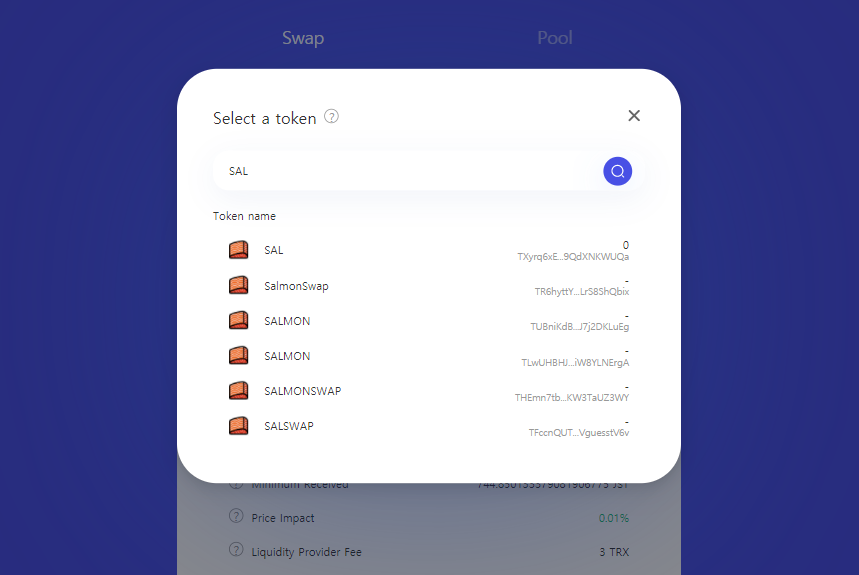 위의 그림에서만 보더라도 SalmonSwap의 SAL토큰의 경우 동일한 이미지와 유사한 이름을 사용하는 스캠 토큰들이 굉장히 많이 검색되는 것을 확인하실 수 있죠.