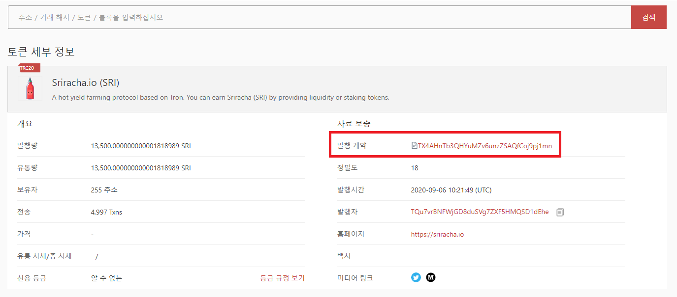 해당 컨트랙트는 트론 블록체인 익스플로러인 트론스캔에서 token20/ 뒤에 있는 주소이기도 합니다. 반드시 토큰 컨트랙트로 거래하고자 하는 상대 토큰을 검색하는 습관을 생활화하셔야만 저스트스왑 이용 시 예상치 못한 피해의 발생 확률을 줄일 수 있으므로, 자주 거래하는 토큰들은 별도로 컨트랙트를 메모하여 저장해놓는 것도 좋은 방법입니다.