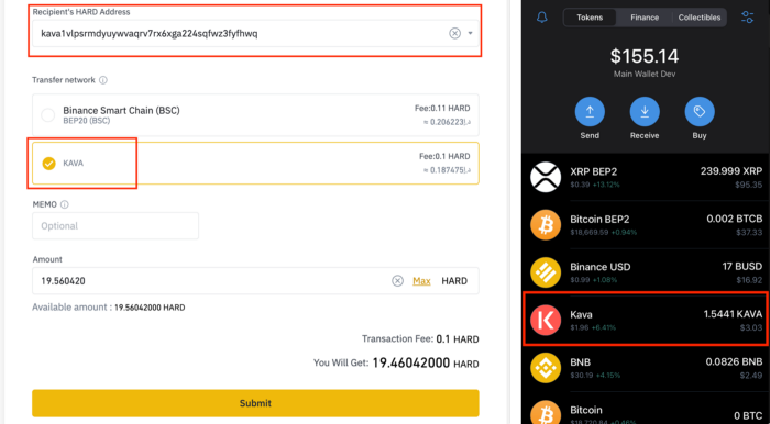 ② 바이낸스 거래소 지갑에서 HARD토큰 출금란으로 접속한 뒤에, 방금 전에 확인한 kava로 시작하는 주소를 입력하고, Transfer network를 KAVA로 선택합니다.