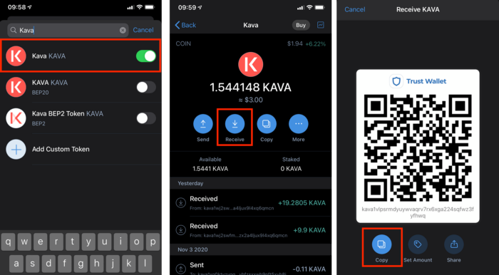 ① 트러스트월렛에서 KAVA를 검색한 뒤에, 내 지갑의 입금 주소(Receive)를 확인합니다