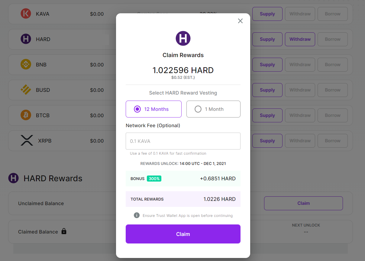 매 블록별로 클레임할 수 있는 HARD토큰의 수량이 업데이트 됩니다. 기존에 Supply를 통해 예치한 HARD토큰은 언제든지 즉시 출금이 가능하지만, 추가로 채굴한 HARD토큰의 경우에는 위에서 설명한 것처럼 1달 또는 12개월 락업 조건이 붙어 있습니다.