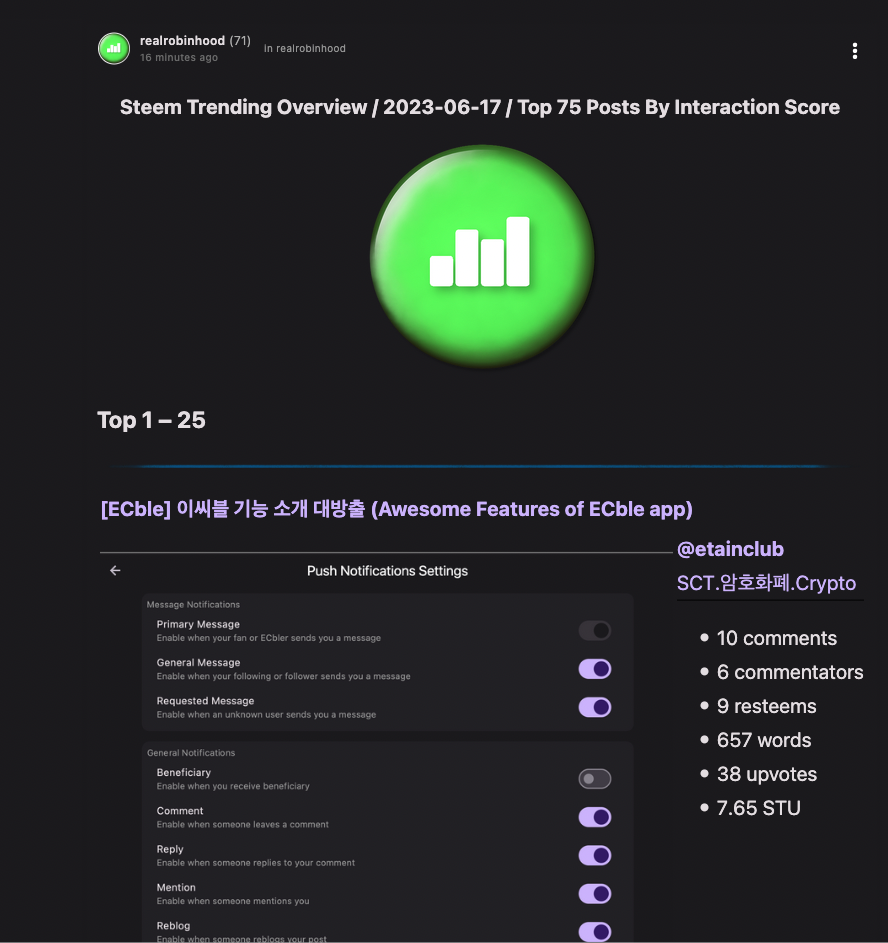 링크: Steem Trending Overview / 2023-06-17 / Top 75 Posts By Interaction Score