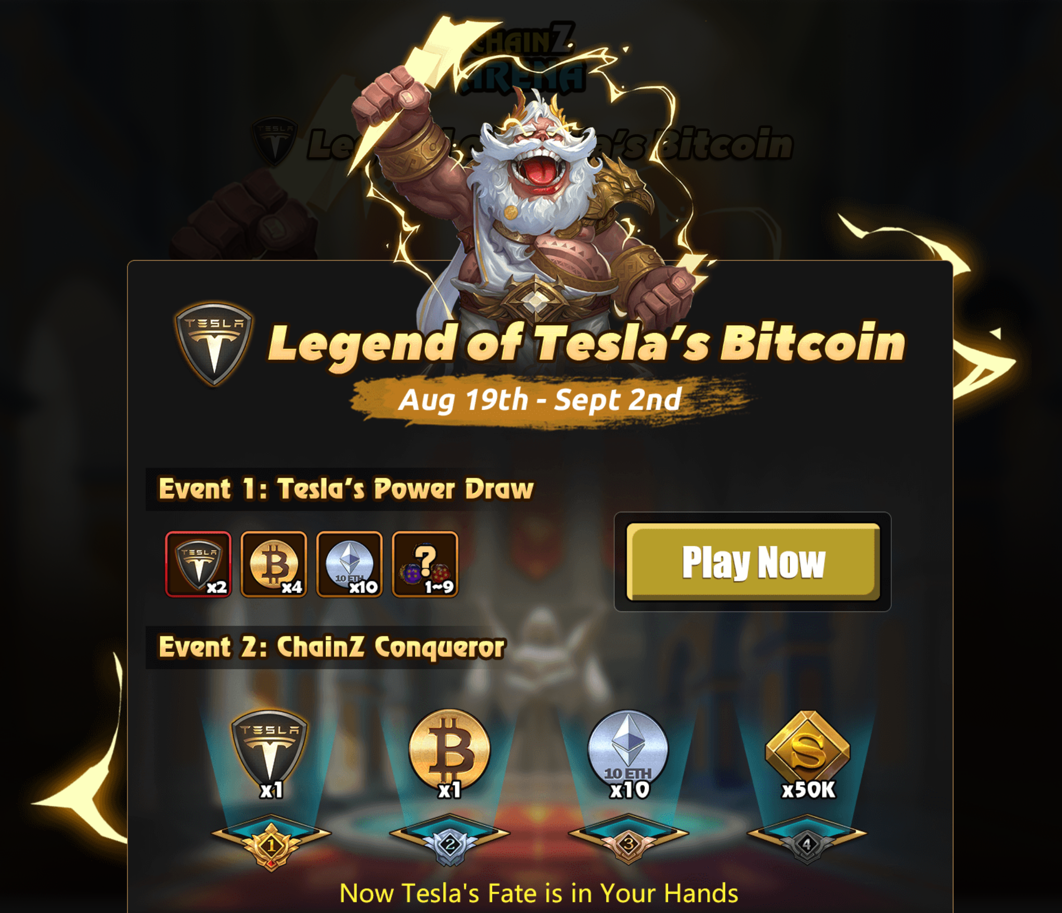 👊🏻Post on Steemit about ChainZ Arena Game and Tesla's Bitcoin Event and get rewarded!