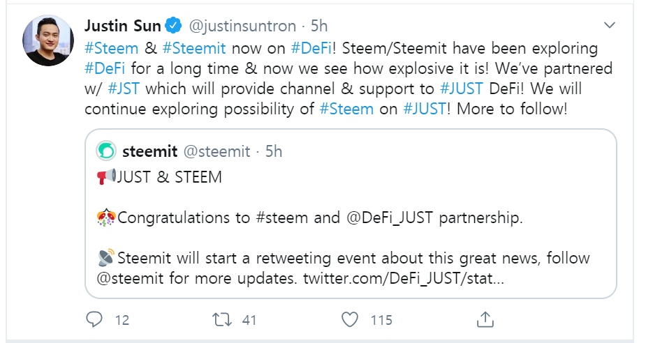 오늘 저스틴이 드디어 스팀도 요즘 대세인 디파이에 합류한다는 트윗을 날렸습니다.
