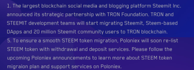 we could argue about that stake, and maybe he did not know what Ned and steemit were saying for 4 years, but if there was a reason for soft fork i would say it is Tron foundation public posts about steem swapping for tron smart token and steem blockchain migrating to tron blockchain. that looks like imminent threat to the blockchain. this was their weekly report just few hours before the Soft fork