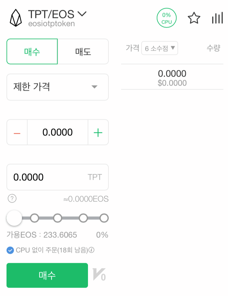 - TPT/EOS 쌍으로 바로 연결이 됩니다. 여기에서 좌측 하단을 보시면 "CPU없이 주문" 기능이 있습니다. 여기를 활성화 시켜주시면, 토큰 포켓앱에서 TPT를 사는 경우에만 CPU가 소모되지 않고 주문을 할 수 있습니다.