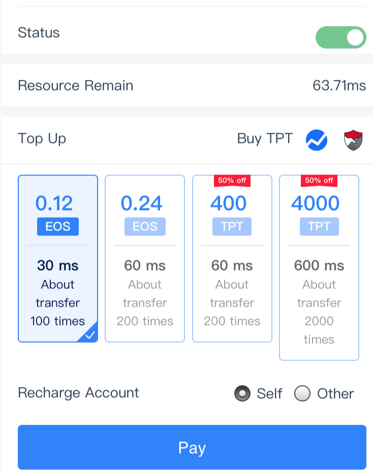 - 가운데를 보면 CPU구매 메뉴가 있습니다. 좌측 2개는 EOS로 구매를 하구요, 우측 2개는 TPT(Token Pocket)을 이용하여 구매 할 수 있습니다.